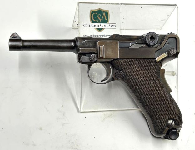 Calibro: 9 x 19 (9 mm Luger) 1907 commerciale, Tutta monomatricola, brunitura condizioni ancora molto buone, guancette originali matricolate, caricatore originale in legno marcato “Cal. 9 mm” SPORTIVA
