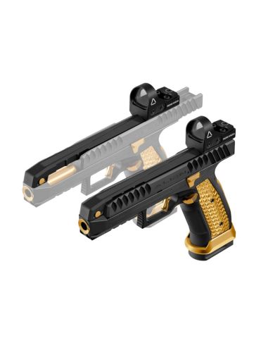 La Laugo Arms Alien Full Kit Serie Limitata “Black Gold” è un'arma di straordinaria eleganza e prestazioni elevate. Caratterizzata da un design futuristico, questa pistola offre un'ottima ergonomia e una presa confortevole, grazie al suo profilo sagomato.