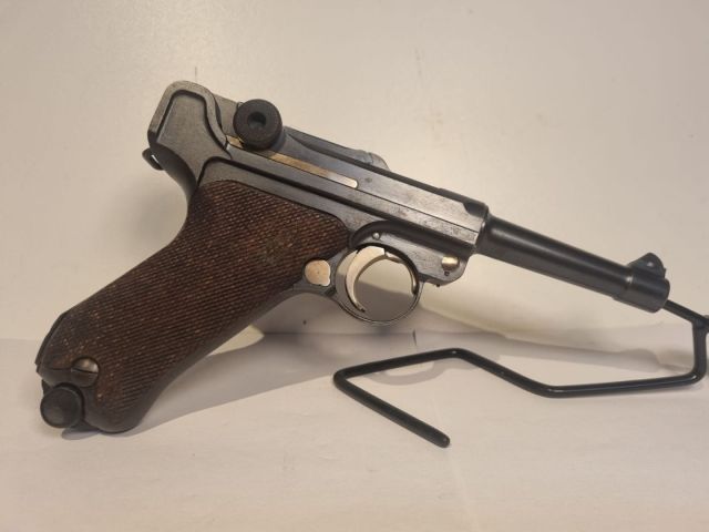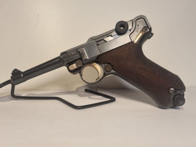 PISTOLA SPORTIVA CAL. 7,65 PARA. PRODOTTA NEL 1923 PER EXPORT NEGLI USA SI DIFFERENZIA DALLE NORMALI 1920, DI FATTO IDENTICHE, PER LA SCRITTE SAFE E LOADED AL POSTO DI GELADEN E GESICHERT SU SICURA ED ESTRATTORE. PRESENTE LA SCRITTA GERMANY SUL TELAIO. PRODOTTE IN SOLI 7000 ESEMPLARI E SOLO IN 7,65 PARA CON CANNA DA 3 7/8 INCHES - 93 MM- HANNO CAMPO MATRICOLARE DEFINITO TRA 73500 E 96000. MONOMATRICOLA ANCHE GUANCETTE E CARICATORE, CONSERVA OLTRE IL 955% DELLA SUA BRUNITURA ORIGINALE E IL GIALLO PAGLIERINO DI SICURA, LEVA SMONTAGGIO, SGANCIO CARICATORE, GRILLETTO E MOLLA ESPULSORE. CANNA PERFETTA E LUCIDA. SI VEDA LUGERS AT RANDOM PAG.203