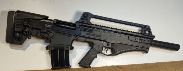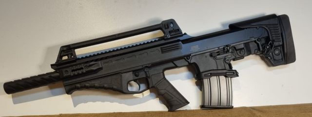 SEMIAUTO CANNA LISCIA CAL. 12 MAG, NUOVO NELLA SUA VALIGIA CON 1 CAR. 3RD, 1 CAR.5RD, DUE CAR. 10RD, 3 STROZZATORI E ACCESSORI VARI. MOLTO COMPATTO GRAZIE ALLA CONFIGURAZIONE BULLPUP HA UNA CANNA DA 50 CM E MIRE REGOLABILI PER TIRO A PALLA E DIVERSI RAIL PER MONTAGGIO ACCESSORI VARI.