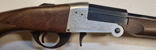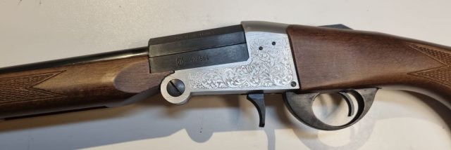 FUCILE MONOCANNA PIEGHEVOLE CAL. 8 FLOBERT CF, 2003, CANNA SENZA BINDELLA CM. 70, BASCULA IN ACCIAIO INCISA A FIORAMI E RICCIOLI, PARI AL NUOVO.