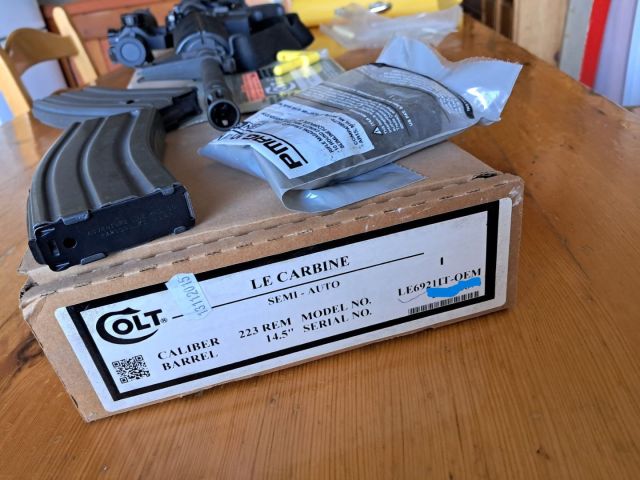 Carabina Colt M4 originale, cal.223R, canna 14,5", come nuova ,in confezione originale con cartaceo; arma sportiva; sparati 100 colpi ,sempre in cassaforte ; mai usata per competizioni o altro. Il prezzo pubblicato si intende per la SOLA carabinna SENZA accessori. Prime due lettere della matricola LE