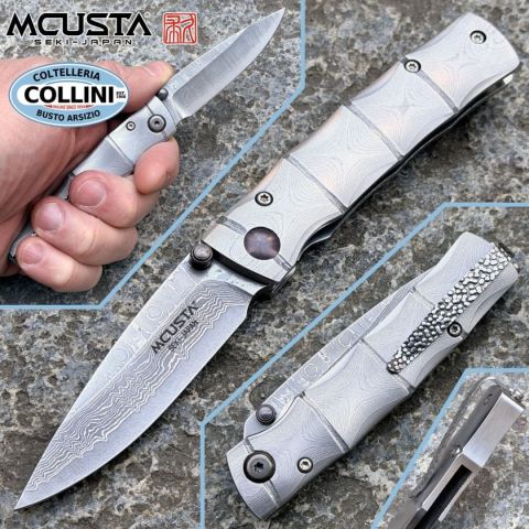 Il Mcusta MC-0033D Take Damasco è un pieghevole giapponese pensato per chi cerca un EDC raffinato ma concreto, con una costruzione che abbina lama damasco con anima in VG-10, chiusura liner lock e manicatura damascata dal disegno ispirato al bamboo: il risultato è un coltello compatto, leggero e curato nelle finiture, espressione della produzione Mcusta di Seki, dove tecnologie moderne e lavorazione hand finished convergono in un folder di forte identità estetica ma pienamente utilizzabile anche nell'impiego quotidiano e nella collezione di coltelleria giapponese. Scheda tecnicaDestinazione d'uso: EDC / collezione. Tipo di produzione: industriale di alta precisione con assemblaggio e finiture manuali. Paese di produzione: Seki, Giappone. Lama: damasco inox a 33 strati con anima in VG-10, durezza 60-61 HRC. Finitura lama: damasco. Manicatura: acciaio damasco con liner in acciaio inox, disegno bamboo. Lunghezza lama: 71 mm. Spessore lama: 3 mm. Lunghezza chiuso: 95 mm. Lunghezza totale: