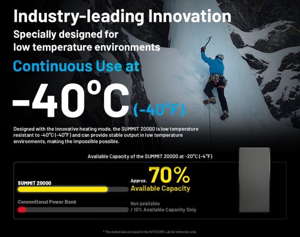 Il NITECORE SUMMIT 20000 è un power bank ad alte prestazioni progettato per resistere e funzionare in condizioni di freddo estremo. È in grado di garantire un utilizzo continuo fino a -40°C, assicurando un’erogazione stabile di energia anche in ambienti dove altri dispositivi smettono di funzionare. Grazie al sistema di riscaldamento PI integrato, il SUMMIT 20000 offre un’elevata efficienza e un riscaldamento rapido, mantenendo la batteria a una temperatura ottimale e riducendo al minimo le perdite di potenza. A -20°C, la capacità disponibile del SUMMIT 20000 è di circa il 70%, mentre i power bank tradizionali spesso non funzionano o offrono appena il 10% della capacità nominale. Il dispositivo attiva automaticamente la Modalità Riscaldamento a Bassa Temperatura quando la temperatura interna scende sotto 0°C e vi è ingresso o uscita di corrente, grazie ai sensori di temperatura intelligenti integrati. Inoltre, la funzione di preriscaldamento si avvia automaticamente quando il powe